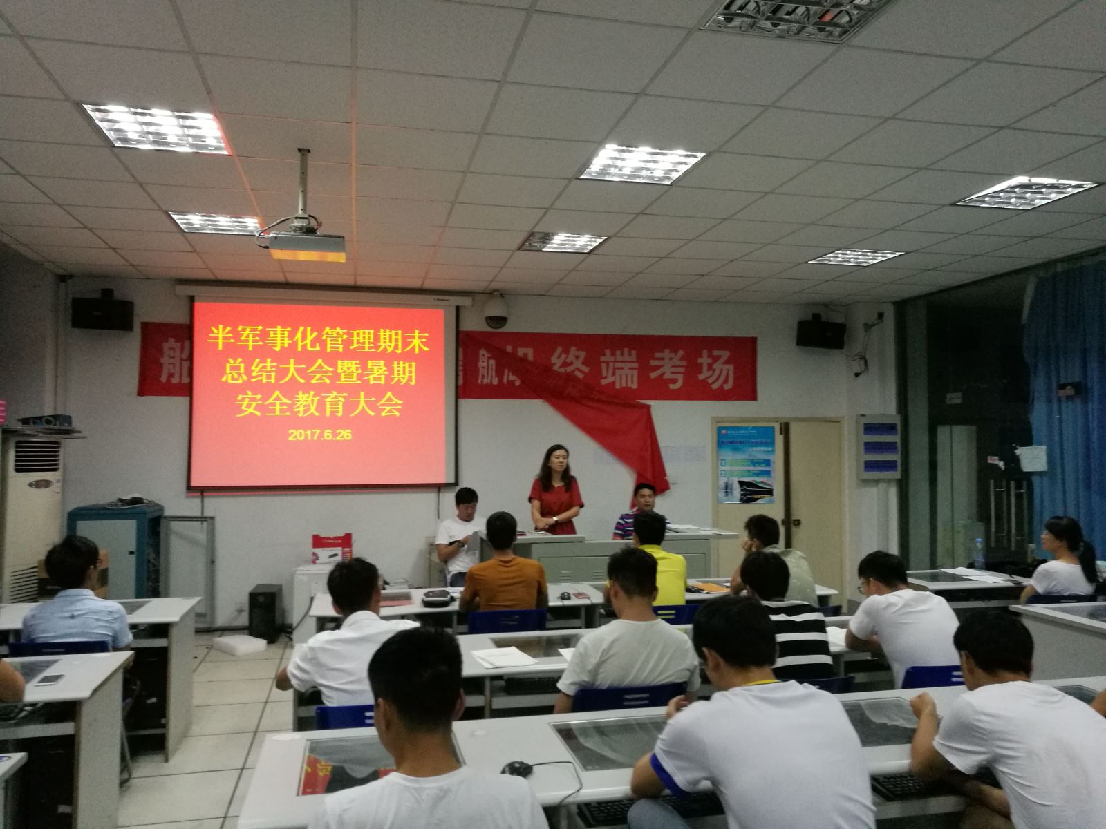 2017年6月26日,水運(yùn)工程系在航海實訓(xùn)樓召開本學(xué)期半軍事化管理期末總結(jié)暨假期安全教育大會。
