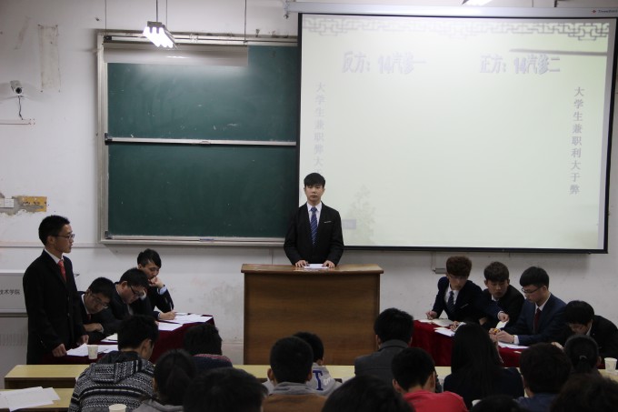 4月12日晚7:00,由汽車與機械工程系團總支學生會舉辦的第十二屆“新月杯”大專辯論賽決賽在南區教學樓西階101教室拉開帷幕。正方14汽修2班代表隊和反方14汽修1班代表隊圍繞“大學生兼職利大于弊還是弊大于利”展開了激烈辯論。