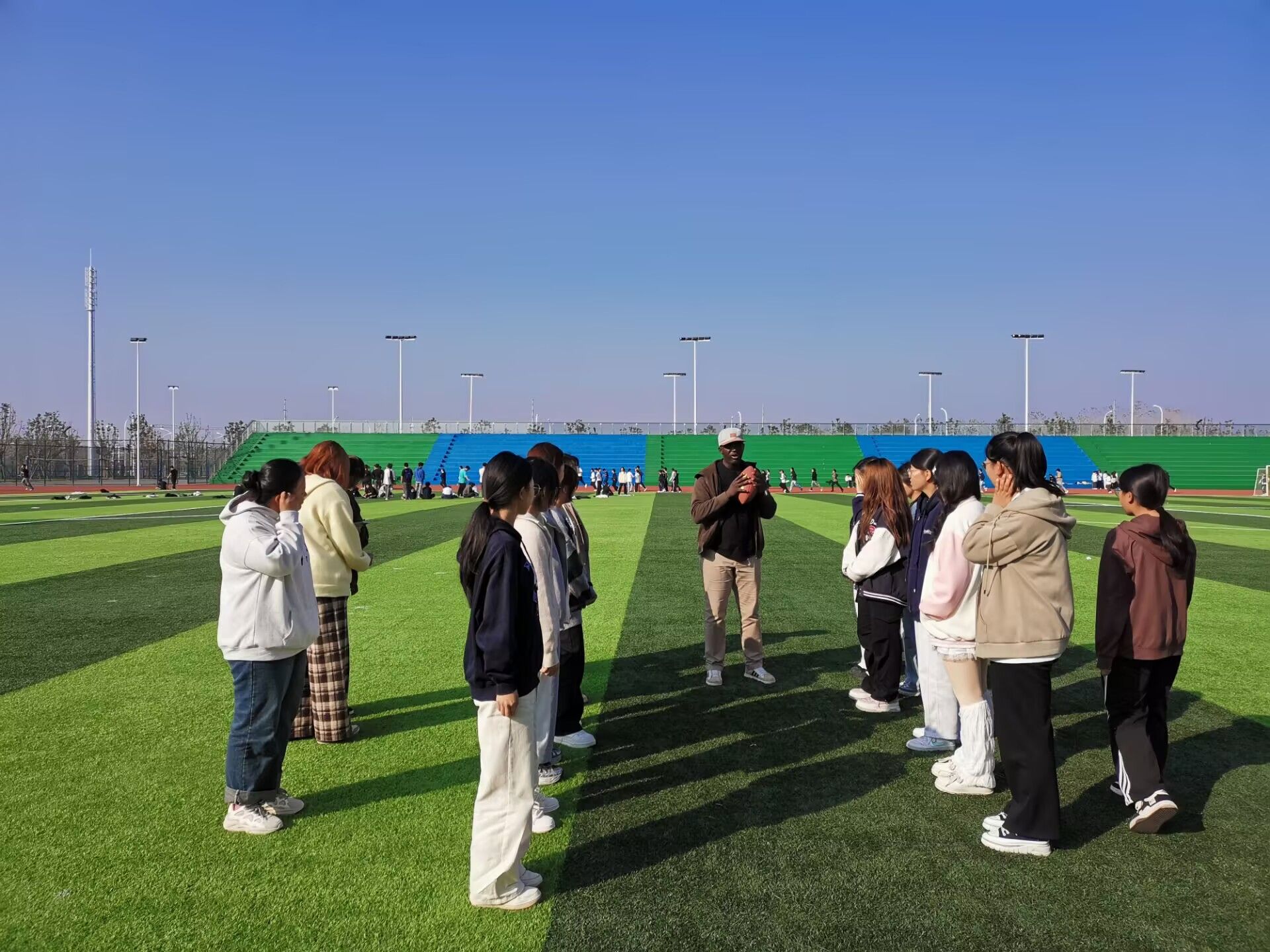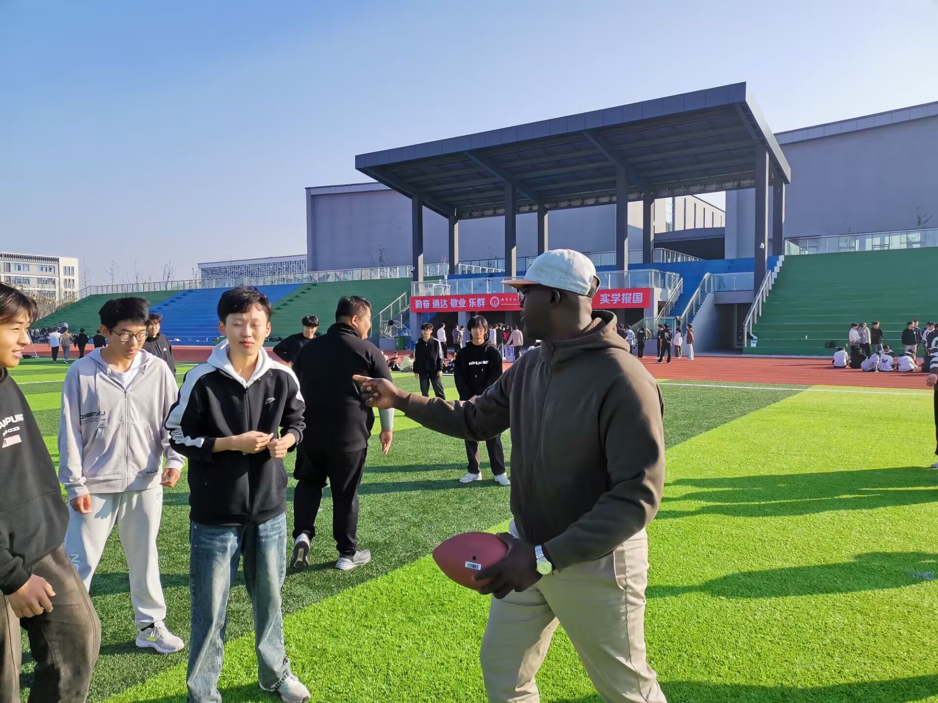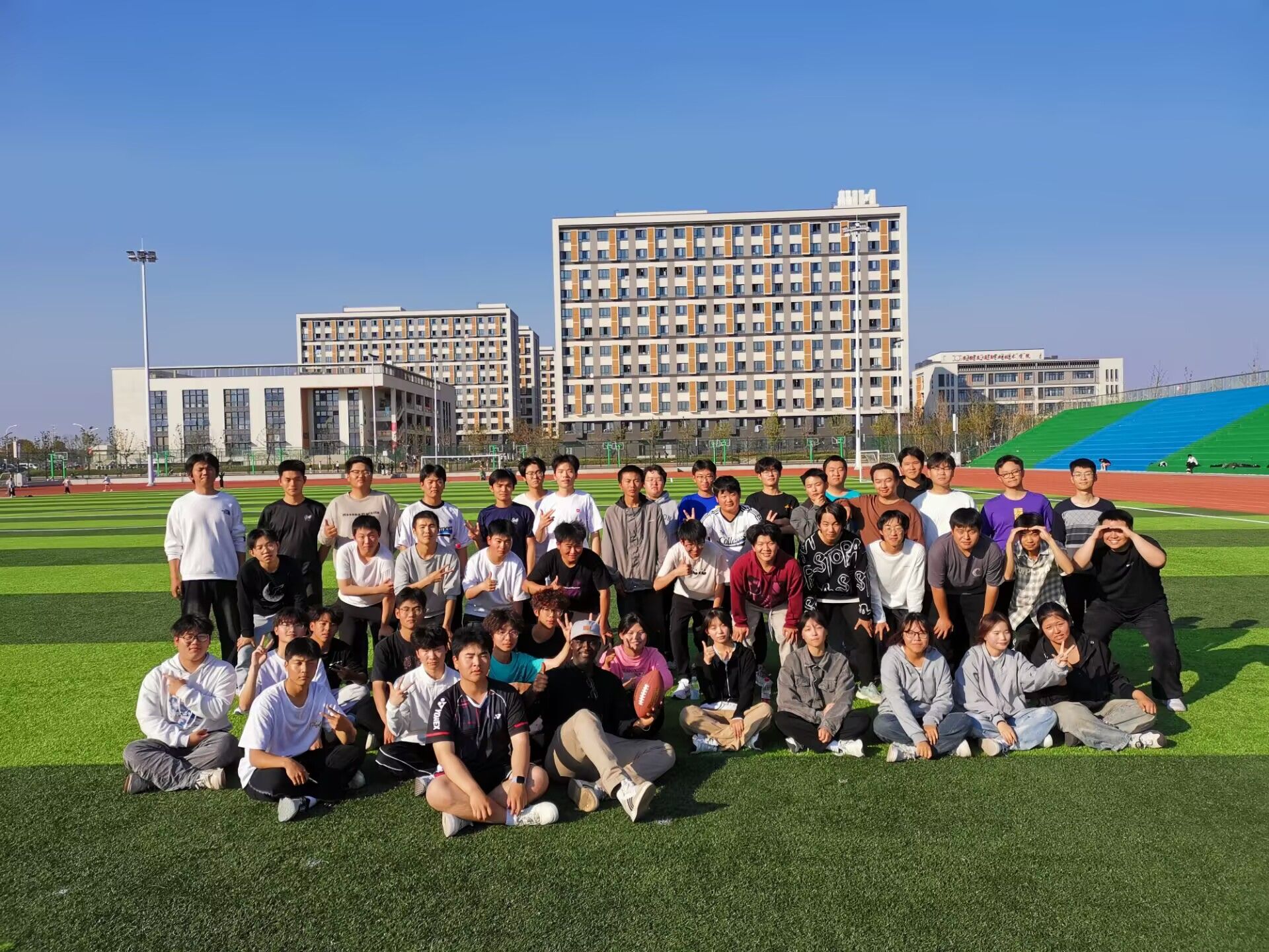 本次活動由城信系2024級計算機應用(中外合作專業)3班和4班的英語外教Mohamadou Djida Isma?l攜手國際班輔導員張偉涵精心策劃,中外合作班級全體學生參加。活動現場,同學在外教老師Mohamadou Djida Isma?l的指導下,將英語學習與橄欖球運動巧妙結合,體驗了精彩的戶外課堂。