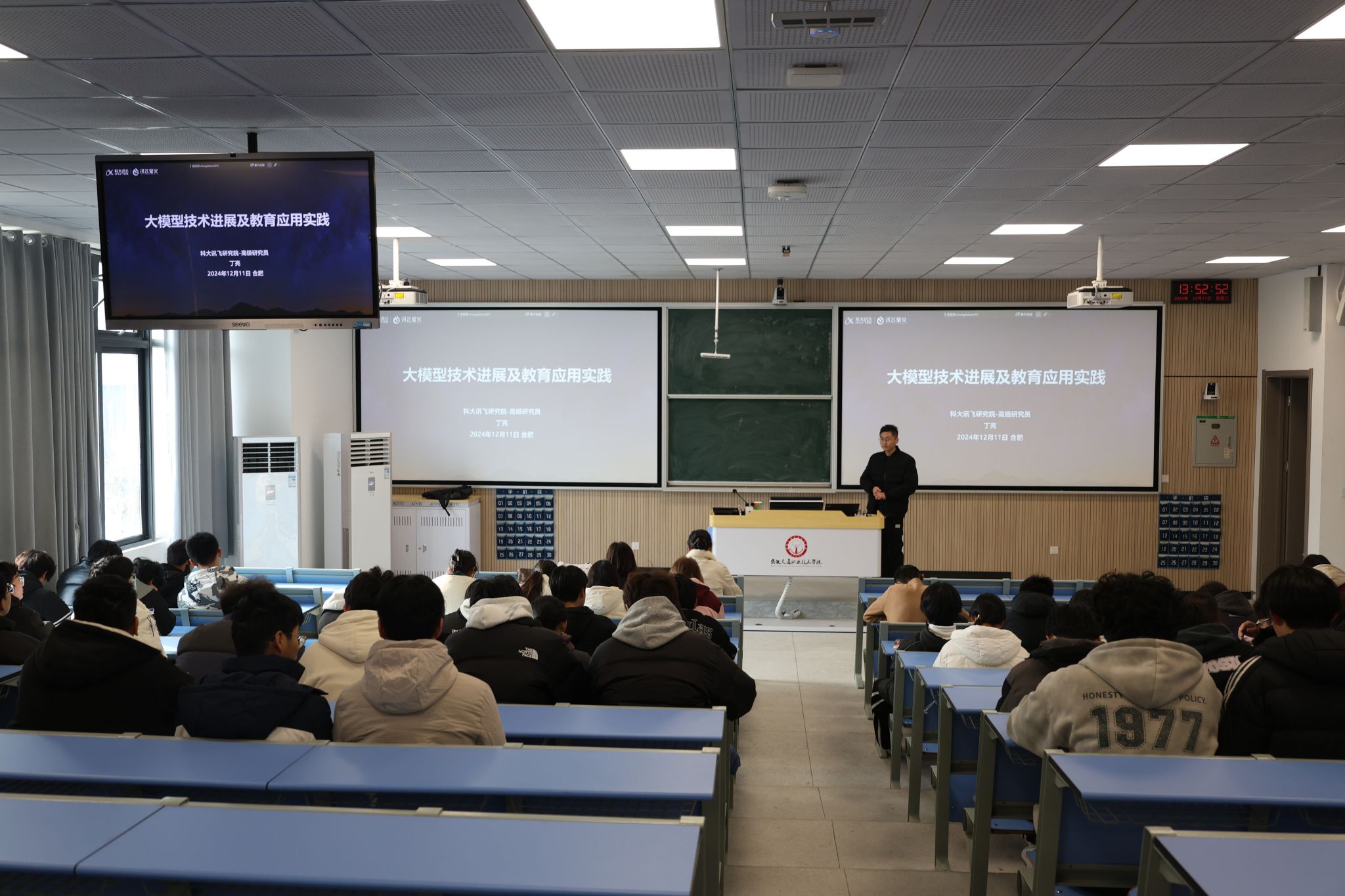 講座上,丁亮研究員分享科大訊飛在語音識別、AI技術(shù)、教育等領(lǐng)域的最新研究成果與應(yīng)用案例。展示了人工智能未來發(fā)展趨勢,分享科大訊飛在大模型、自主可控技術(shù)等方面的戰(zhàn)略規(guī)劃,以及如何通過技術(shù)創(chuàng)新推動社會進步和產(chǎn)業(yè)升級。講座設(shè)置了互動環(huán)節(jié),丁亮研究員與同學(xué)們進行了學(xué)術(shù)交流,解答了關(guān)于AI技術(shù)的疑問。同時,通過生動有趣的科普講解,激發(fā)了同學(xué)們對AI技術(shù)的好奇心和探索熱情。
