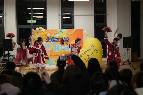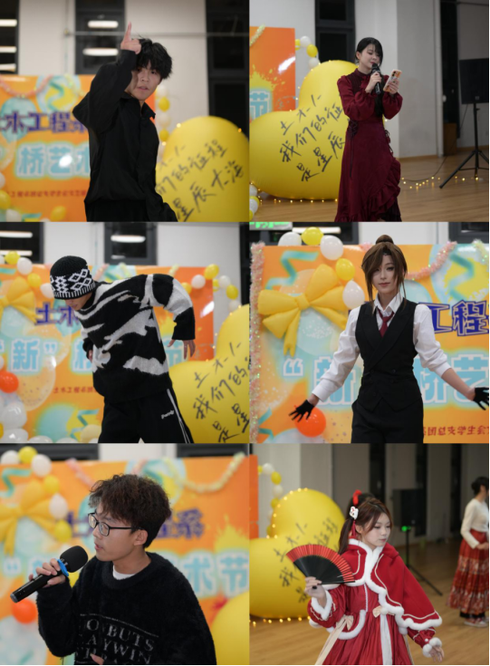 夜幕降臨,體育館內燈光璀璨,舞臺上的燈光閃爍,為這場藝術節增添了幾分神秘與浪漫。土木系的學生們身著各式各樣的服裝,有的身著傳統漢服,展現古典韻味;有的則穿著現代潮流服飾,彰顯青春活力。隨著《第一天》+《快樂崇拜》音樂串燒開場,各位同學帶來女團舞《寄明月》、民族舞《無情畫》、男生獨舞《Back Seat》《修煉愛情》等、歌曲《天外來物》《武家坡》《天邊最亮的星》等歌舞節目,還特別邀請了大學生藝術團的成員們前來助陣,以舞會友,以歌助興,表演了《意外》等節目,與土木學子們共同演繹了一場視聽盛宴,詮釋了青春的美好與激情。