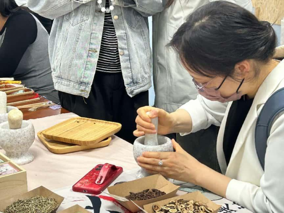 在下午學院書畫展開展儀式的現場,香囊制作活動同樣也吸引了大批的師生駐足攤位前欣賞“文人香”制品,討論香料配方,手握石臼研磨香料,體驗香囊制作工藝。