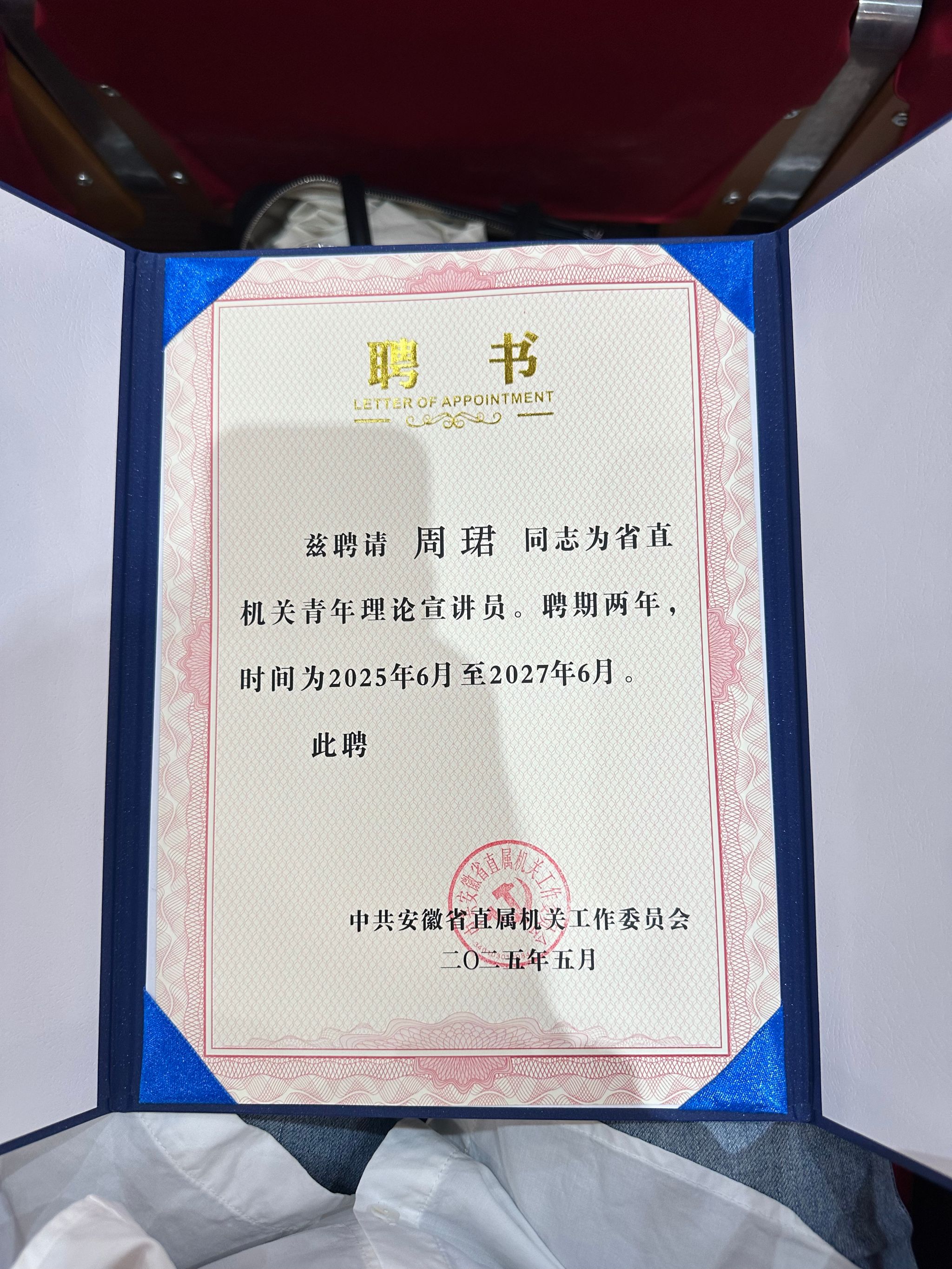 5月30日上午,安徽省直機關工委召開2025年“走基層送理論 重實踐建新功”青年集中宣講調研動員部署暨業務培訓會議,城信系周珺老師作為青年理論宣講員代表受邀參會,并現場接受聘書。