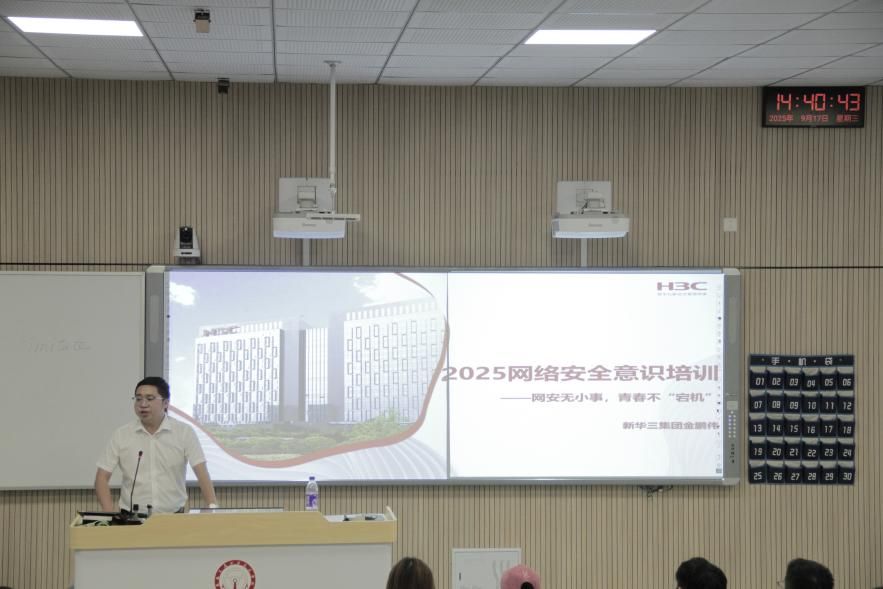 隨后,新華三信息安全有限公司產(chǎn)教融合部部長(zhǎng)金鵬偉帶來 “網(wǎng)絡(luò)安全意識(shí)培訓(xùn)與個(gè)人數(shù)據(jù)保護(hù)” 主題講座。金部長(zhǎng)圍繞當(dāng)前網(wǎng)絡(luò)安全熱點(diǎn)問題,詳細(xì)解讀網(wǎng)絡(luò)安全風(fēng)險(xiǎn)隱患,重點(diǎn)講解個(gè)人數(shù)據(jù)保護(hù)的重要性及實(shí)用防護(hù)方法,通過演示常見網(wǎng)絡(luò)安全攻擊案例,提升新生的網(wǎng)絡(luò)安全防范意識(shí)和應(yīng)對(duì)能力,引導(dǎo)新生在學(xué)習(xí)和生活中重視網(wǎng)絡(luò)安全,守護(hù)個(gè)人信息安全。