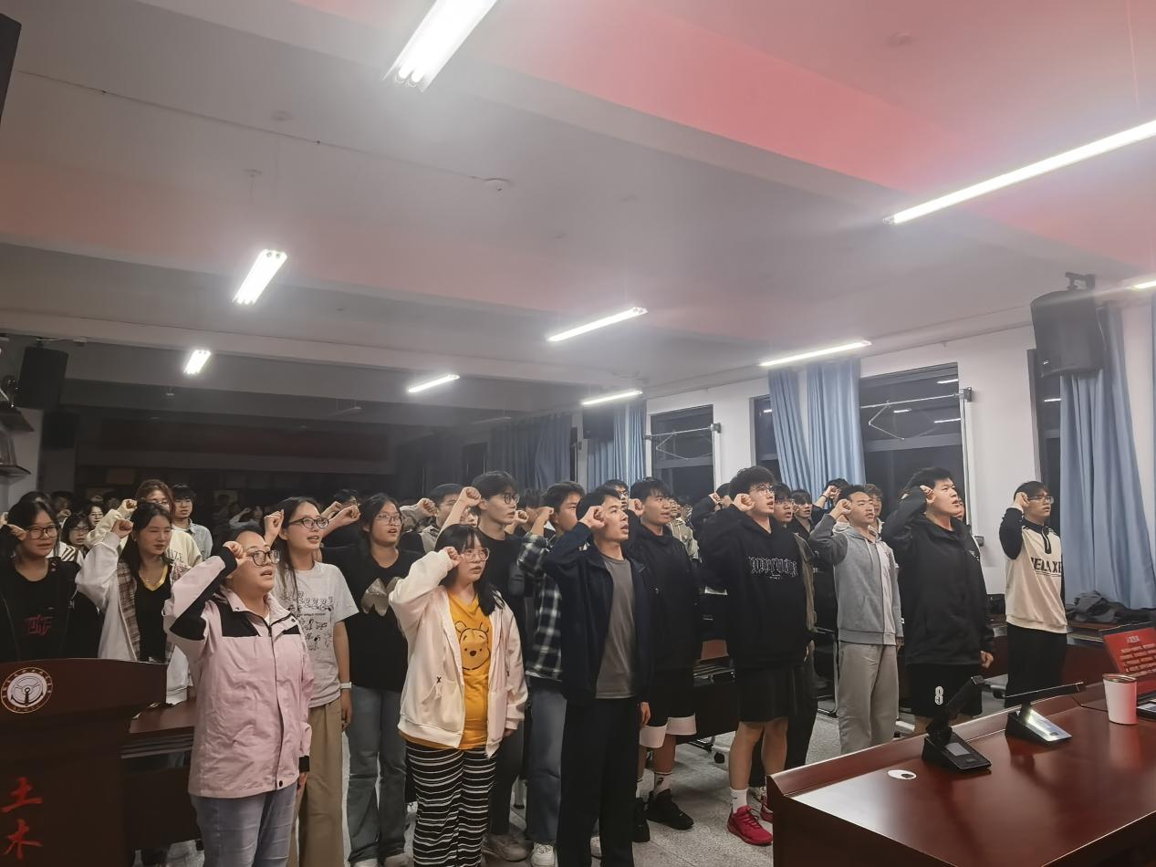 團課最后,在莊嚴肅穆的氛圍中,來自學生黨支部的學生黨員冀董洋帶領全體與會人員,面向黨旗,領讀入黨誓詞。鏗鏘有力的誓言,表達了土木青年堅定不移跟黨走、為共產主義事業奮斗終身的堅定決心。