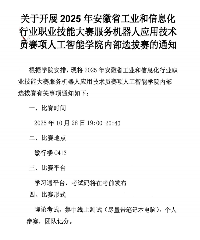 關于開展2025年安徽省工業和信息化行業職業技能大賽服務機器人應用技術員賽項人工智能學院內部選拔賽的通知