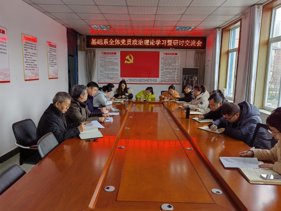 2月29日, 基礎系召開政治理論學習會,跟進學習習近平總書記最新重要講話精神,專題學習反對形式主義官僚主義深化作風建設,同時組織研討活動。系黨總支書記邵登泰主持會議,全體黨員參加。