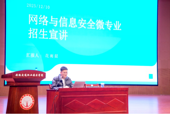 為響應國家網絡安全戰略與教育部“雙千”計劃,滿足數字經濟時代對實戰型安全人才的迫切需求,安徽交通職業技術學院人工智能學院聯合網絡安全頭部企業打造“網絡與信息安全”微專業。2025年12月10日下午,“網絡與信息安全”微專業招生宣講會在經世大禮堂舉行。本次宣講會以“筑牢數字基石 開啟安全未來”為主題,邀請行業權威專家傾情分享,面向全校大一、大二學生全方位解讀網絡安全領域的職業新機遇,吸引了數百名對計算機、網絡及信息安全感興趣的學生參與。
