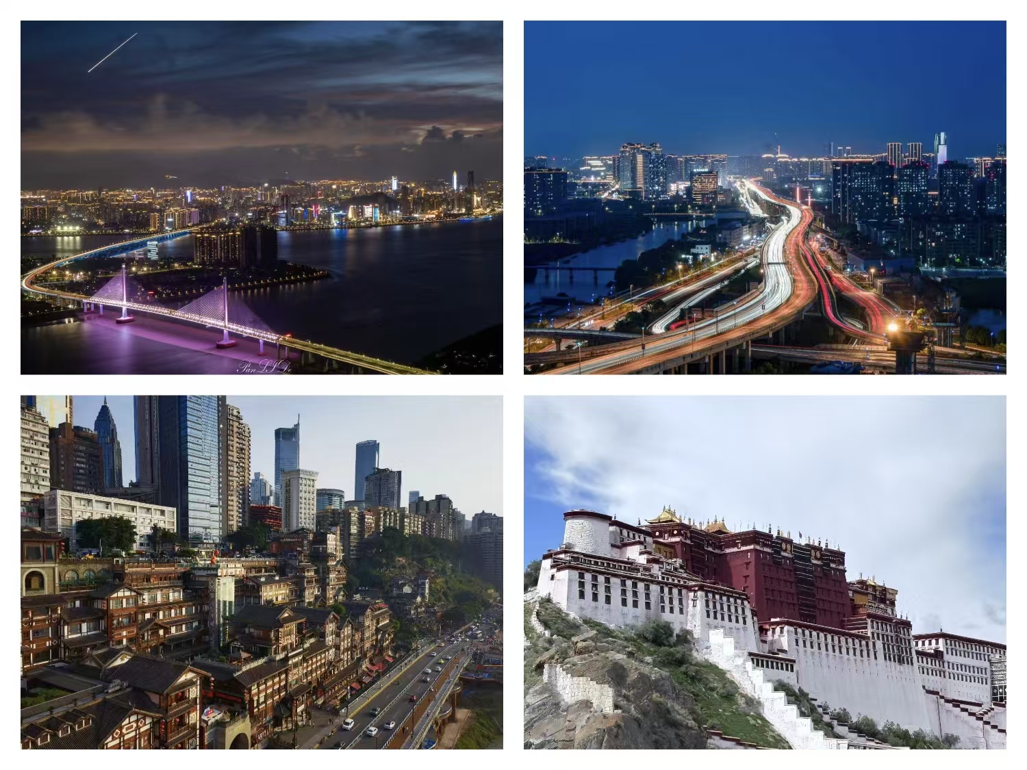 作品還聚焦祖國(guó)的現(xiàn)代化發(fā)展與文化傳承,訴說(shuō)青年對(duì)時(shí)代機(jī)遇的感恩:都市脈搏:夜幕下的跨江大橋霓虹流轉(zhuǎn),縱橫交錯(cuò)的交通路網(wǎng)流光溢彩,彰顯現(xiàn)代化發(fā)展的速度與活力;文化底蘊(yùn):依山而建的山城街巷新舊交融,高原之上的布達(dá)拉宮莊嚴(yán)矗立,訴說(shuō)著民族文化的厚重璀璨。鏡頭下的祖國(guó)“日新月異卻底蘊(yùn)綿長(zhǎng)” 。