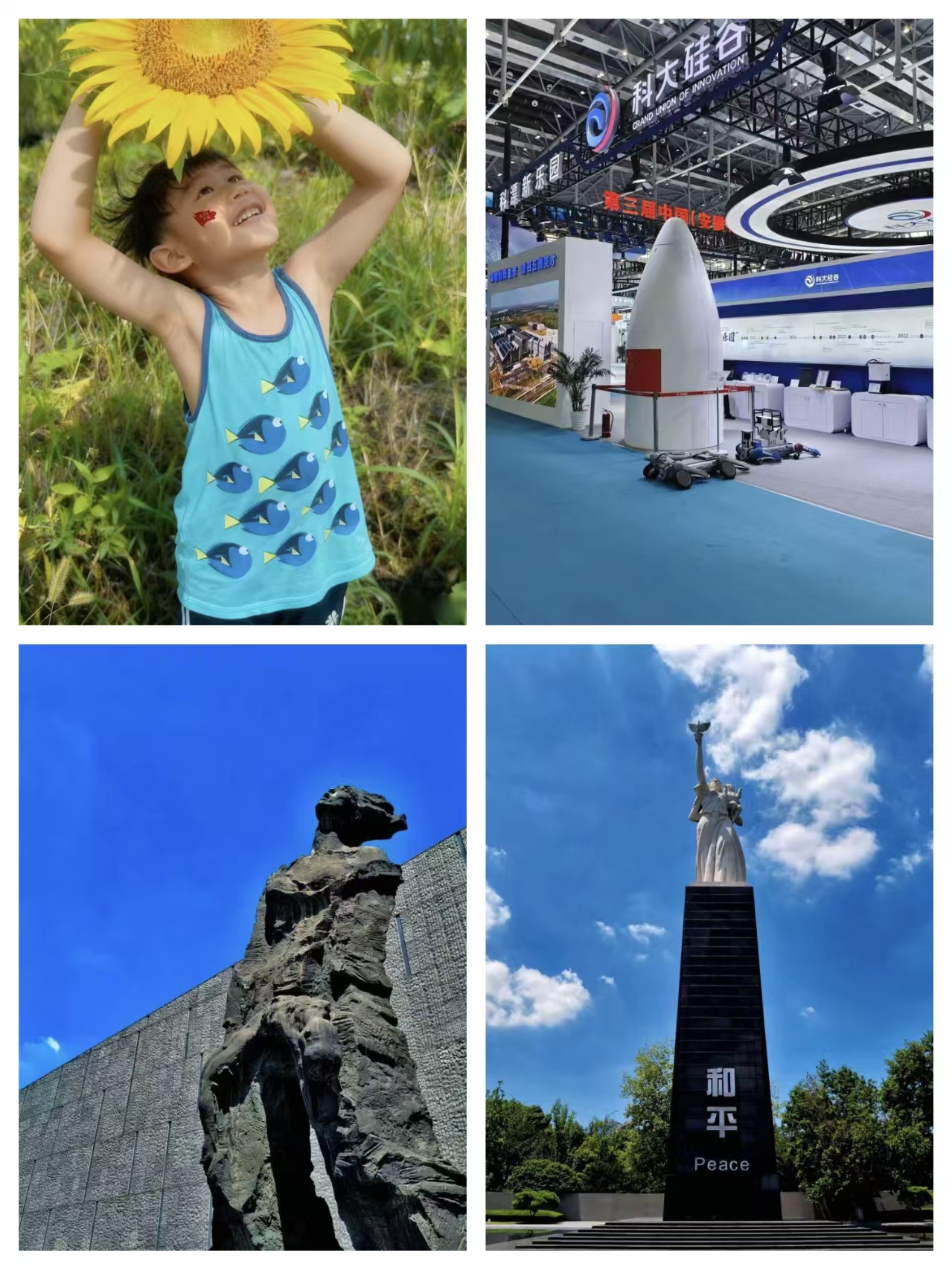 作品更以細(xì)膩的視角,觸摸祖國(guó)的溫度與愿景,將感恩之情具象化為生活點(diǎn)滴:民生幸福:孩童舉著向日葵的笑臉、科創(chuàng)展臺(tái)的智能設(shè)備,展現(xiàn)祖國(guó)守護(hù)下的歲月靜好與成長(zhǎng)平臺(tái);歷史銘記:滄桑雕塑凝固歷史記憶,提醒今日榮光的來(lái)之不易,感恩先輩的砥礪前行;和平期許:“和平”主題雕塑在晴空下舒展,承載對(duì)家國(guó)安寧的珍視與對(duì)未來(lái)的美好憧憬。生活之甜到科技之進(jìn),從歷史之思到和平之愿,鏡頭里的每一幀畫面,都是青年對(duì)祖國(guó)最滾燙的感恩告白。