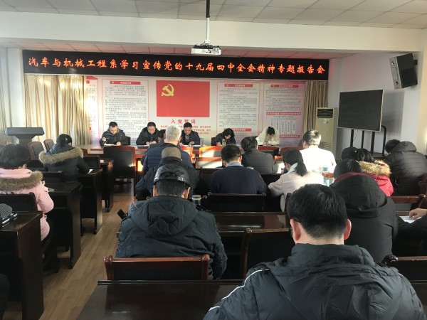 12月31日下午,根據《中共安徽省委教育工委關于做好全省高校學習傳達黨的十九屆四中全會精神工作的通知》和學院《關于認真組織學習黨的十九屆四中全會精神有關事項的通知》要求,我系舉行學習宣傳黨的十九屆四中全會精神專題報告會,系黨總支書記李家林做專題報告,全體教職工參加了報告會。