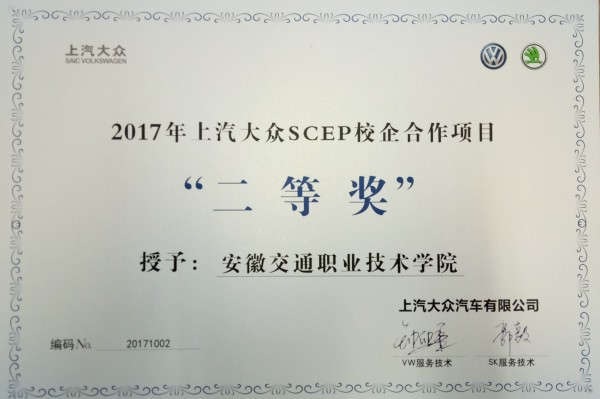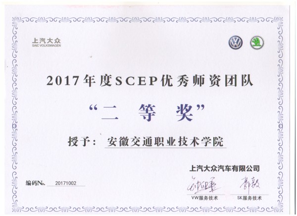 此次上海大眾 SCEP項目年度考核從師資團隊、教學質量、學制流程、學生情況、專項工作、場地形象、教學設施、工具設備、信息設備9大指標進行綜合考核。我院在今年的9大指標考核中,成績突出,在全國20所上汽大眾SCEP校企合作院校綜合考核中排名第2,榮獲“2017年上汽大眾SCEP校企合作項目二等獎”。同時,我院SCEP項目教師團隊榮獲“2017年上汽大眾SCEP優秀師資團隊二等獎”,另SCEP項目組湯峰、王雷、王傳磊、張翼4名老師因教學業績優異,分獲上汽大眾SCEP項目優秀教師二等獎和三等獎,這些獎項的獲得是上海大眾對我院上汽大眾SCEP項目運行成效最大的肯定,同時也是給予我院SCEP項目的鞭策和激勵。