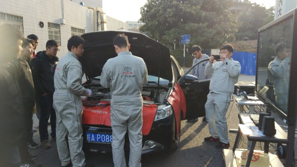 本次T-TEP校企合作項目豐田班建設活動的主要內容有:車輛健康檢查、豐田教具展示、豐田雙擎車輛展示。車輛健康檢查工位配備了豐田專用診斷電腦并連接了大屏幕,直觀的演示車輛健康體檢過程;展示的豐田專用教具有整車電氣系統、豐田混動模型、解剖車模、TCCS控制系統示教板等;展示的車輛有凱美瑞雙擎、普銳斯、雷凌雙擎等。此次活動全程由豐田班學生進行操作與現場講解,安徽偉世行豐田汽車銷售服務有限公司的技師提供技術支持。
