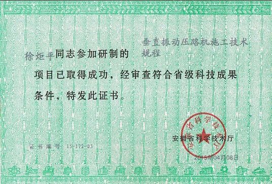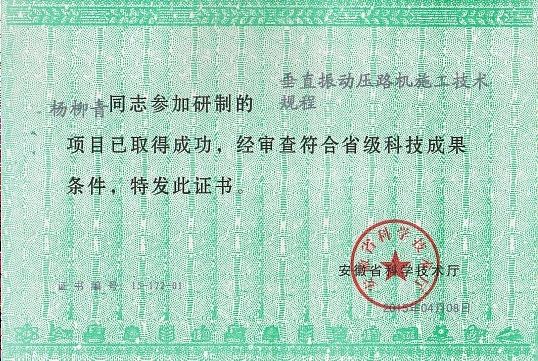 該項目于2011年8月正式立項,2014年8月正式完成,經安徽省質量技術監督局批準于2014年9月28日正式發布安徽省地方標準《垂直振動壓路機施工技術規程》(DB34/T 2152—2014),行業主管部門安徽省交通運輸廳于2014年10月19日在合肥宣貫。
