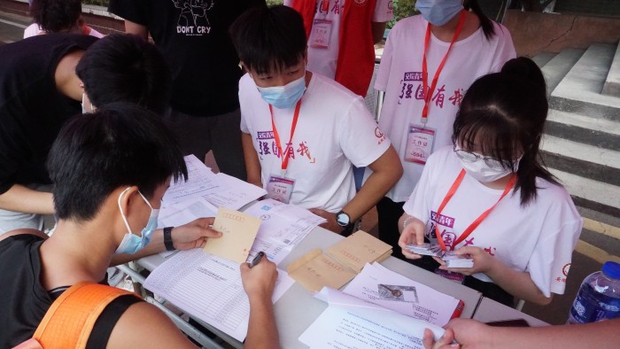 身穿紅色馬甲的志愿者早早集結,為陸續到來的新生有序提供接待引導、行李搬運、介紹咨詢等服務,師生志愿者個個熱情高漲,迎新工作井然有序。