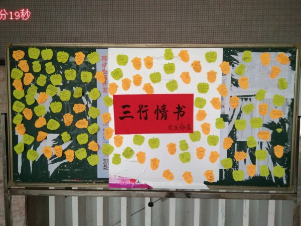 3月4日晚,女生部進(jìn)班宣傳活動(dòng)時(shí),男生自愿在便利紙寫上自己的三行情書,當(dāng)情書張貼在教學(xué)樓一樓大廳的展板時(shí),和諧溫馨的節(jié)日氣氛立刻就充滿了整個(gè)校園,吸引了眾多的同學(xué)前來觀看。女生部還抽取了部分感人情書將作為趣味游戲活動(dòng)的入場(chǎng)券。