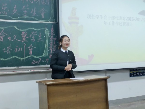 會議開始后,首先由15級學生干部代表孫小闖和房春妮作述職報告,學生會主席孫小闖學長回顧了2016-2017學年的學生會工作,表示在學生會中獲得了充分的鍛煉,收獲滿滿,并對下一屆學生會干部提出了一些中肯的建議。接著,學生會指導老師鐘飛飛老師宣讀新一屆學生會干部擬用名單并對學生干部工作細則進行了具體解讀,希望同學們再接再厲,在工作中大膽創新,逐步完善學生會各類規章制度,為學生會注入新的活力。隨后,新一屆學生會干部代表陳明和許敏發言,感謝老師和同學們的信任,會認真投入工作,為學生會奉獻自己的力量。