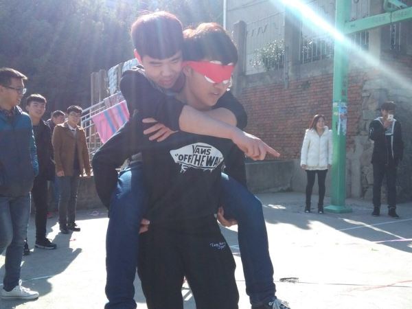 本次活動(dòng)項(xiàng)目趣味性與挑戰(zhàn)性并存,涵蓋“聯(lián)機(jī)籃球、捆綁過關(guān)、瞎子和瘸子”三個(gè)環(huán)節(jié),主要考驗(yàn)同學(xué)們的協(xié)調(diào)合作能力。聯(lián)機(jī)籃球環(huán)節(jié),每輪四支隊(duì)伍,兩支隊(duì)伍合作對(duì)抗另外兩支隊(duì)伍,兩個(gè)人的手腳綁在一起打籃球;捆綁過關(guān)環(huán)節(jié),一隊(duì)三個(gè)人手腳綁在一起,一人倒水,一人拿水給另一人喝,兩人剝糖果給第三人吃;瞎子和瘸子環(huán)節(jié),一人蒙著眼睛背著另外一人,由被背的人指揮踩氣球。盡管天氣寒冷,但同學(xué)們熱情高漲,參賽隊(duì)員一個(gè)個(gè)精神抖擻,遠(yuǎn)離了“低頭族”“手機(jī)黨”“數(shù)碼控”的消極形象,展示了真正屬于年輕人的青春活力,現(xiàn)場(chǎng)十分熱鬧。