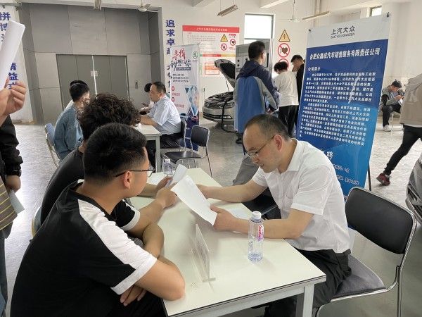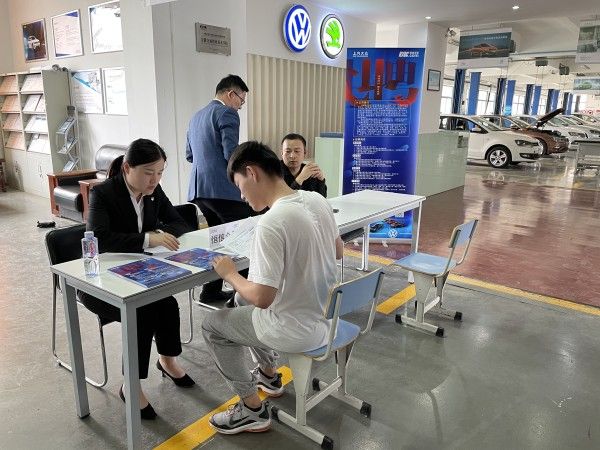 下午2點招聘會正式開始,19級大眾定向班共計75名同學躍躍欲試,現場氣氛熱烈,有意向學生駐足企業招聘席位前,與企業代表進行了深入的交流。經過經銷商的初輪面試,最終有41名同學與用人單位達成初步的實習錄用意向。招聘會后,學院將根據招聘情況組建“上汽大眾”訂單班。