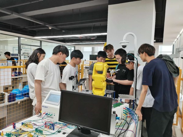 同學們首先參觀了哈工大機器人集團,看到了汽車焊接、無人搬運、航空機器人、手術機器人等當前工業機器人最新的發展狀況和應用情況。同學們還聽取了哈工大機器人集團子公司哈工海渡的專家關于工業機器人行業發展的報告,了解了智能制造與工業機器人的現狀和趨勢。最后,在專業老師的指導下,同學們利用發那科機器人進行實際操作,實現點對點運動,并在此基礎上進行發散練習,通過實操豐富了學生的實踐經驗。