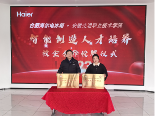 戴明陽對學院開展訪企拓崗促就業活動表示熱烈歡迎,并陪同梁洪波一行參觀了合肥海爾電冰箱有限公司的智慧生產車間。李佳慧從企業現狀、基地建設背景、建設模式、資源投入等方面對公司進行了詳細介紹。梁洪波介紹了我院的辦學歷史、專業建設情況、校企合作歷程,表示海爾在產教融合方面做的很有特色,希望雙方能夠發揮各自的優勢,在師資培養、課程設置、基地建設方面持續創新,取得一批可復制、可推廣的成果,為學生提供良好的就業環境,提升學生的幸福感。會后,梁洪波和戴明陽共同為“智能制造產業人才培養合作基地”揭牌。