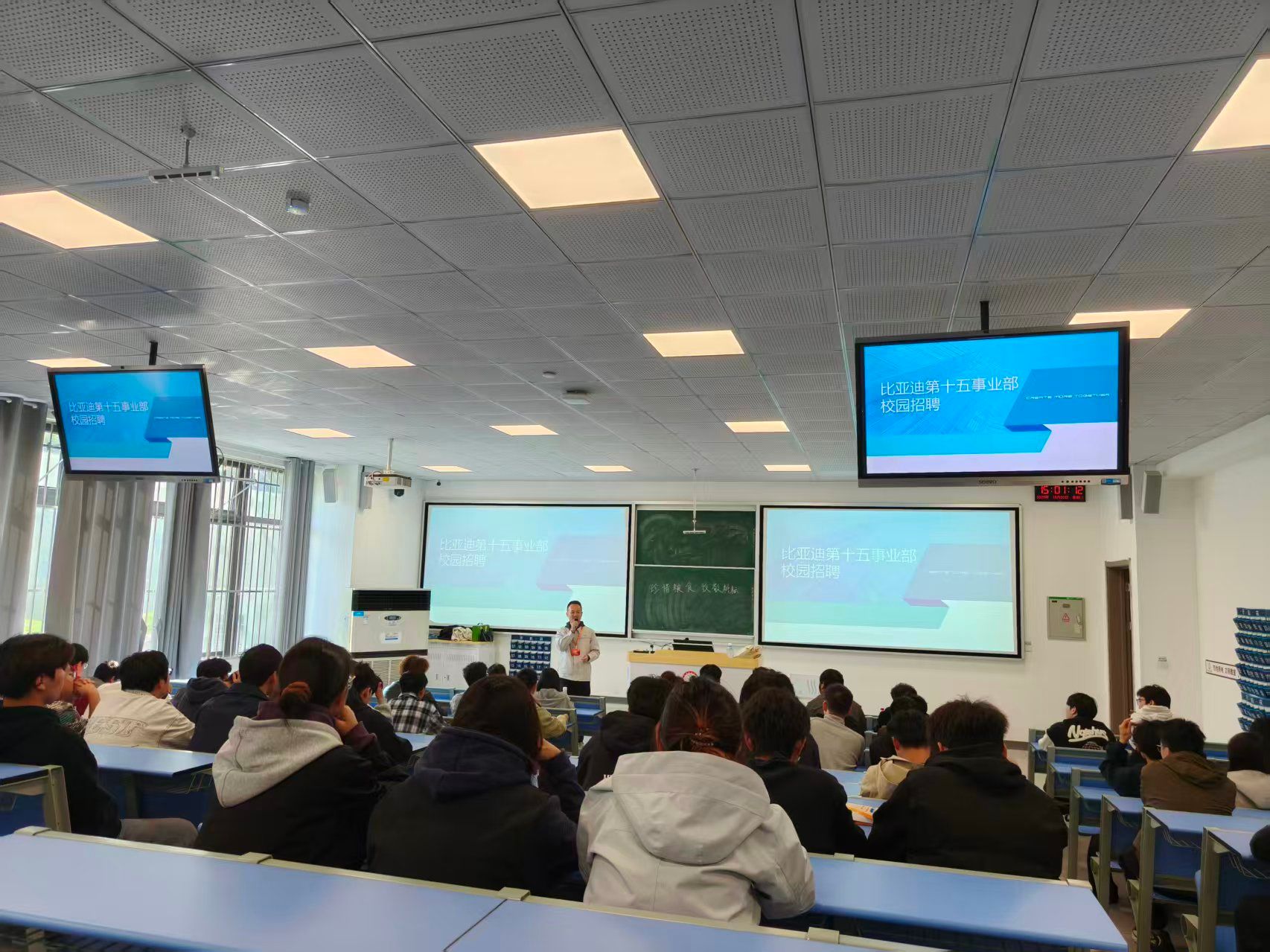 近日,比亞迪第十五事業(yè)部校園招聘宣講會(huì)走進(jìn)我院,吸引了23、24 級(jí)學(xué)生參與,25 級(jí)新生也主動(dòng)到場 “圍觀”,各年級(jí)學(xué)子共同解鎖企業(yè)就業(yè) “提前批” 信息。