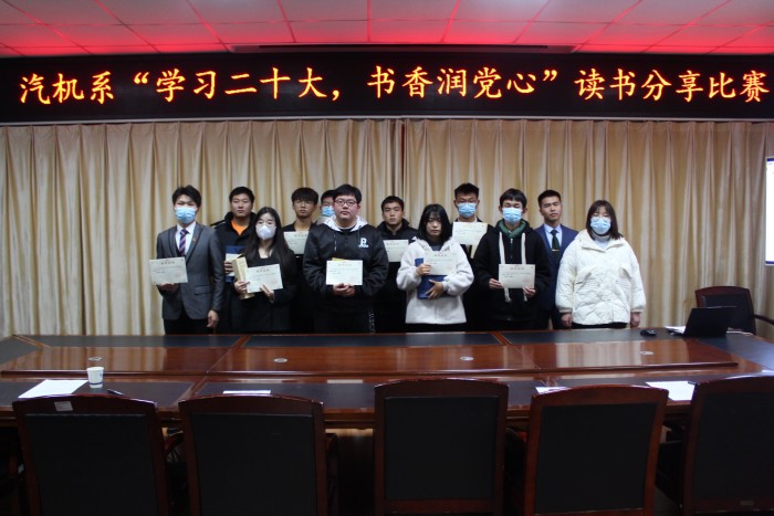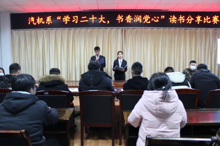 黨的二十大報告明確指出,深化全民閱讀活動。為激發廣大同學愛讀書、讀好書、薦好書的良好風尚,營造濃厚的書香校園氛圍,12月4日晚,汽車與機械工程系“學習二十大,書香潤黨心”讀書分享比賽在南區教學樓三樓會議室開展。來自21級、22級的二十余名同學參加了此次活動。