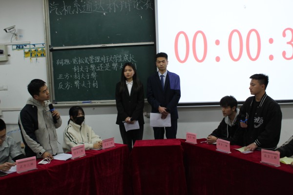 首場比賽在22智能汽車班和22新能源2班兩支辯論隊之間打響,雙方辯手圍繞“寬松式管理對于大學生,利大于弊還是弊大于利?”這一辯題展開了激烈的角逐。作為正方的22智能汽車班代表隊從“寬松式管理”定義入手,指出寬松與管理的對立統一關系,認為寬松式管理更有利于大學生自身發展;作為反方的22新能源2班也并不示弱,認為寬松式管理的實現需要兩個必須的前提,完備的體制和大學生較強的自制力,實際上很難達到,寬松式管理弊大于利。攻辯環節雙方引經據典、你來我往、侃侃而談。自由辯論環節中,更是唇槍舌劍的激烈交鋒,參賽選手通過辯論技巧、邏輯思維的較量,為觀眾帶來了一場思辨的盛宴。經過激烈角逐,22智能汽車班憑借出色的表現贏得本場比賽。