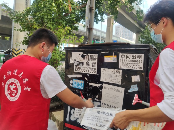 雖然烈日炎炎,但同學(xué)們參加志愿服務(wù)的活動熱情不減,大家根據(jù)需要清理的街道范圍及清理內(nèi)容進(jìn)行了分工。志愿者們明確目標(biāo)后立即進(jìn)入工作狀態(tài),有的負(fù)責(zé)清理紙屑、落葉、食品包裝袋等垃圾,有的負(fù)責(zé)鏟除墻面小廣告,還有的對雜亂停放的共享單車進(jìn)行整理,大家互相配合,甚是默契。雖然渾身滿是汗水,但是志愿者們的臉上洋溢著笑容。經(jīng)過四個多小時的辛勤勞動,街道環(huán)境變得整齊有序。