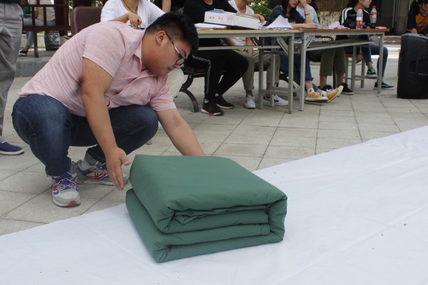 5月29日下午,到了最讓大家期待的現場比拼環節,各晉級宿舍分別派出一名參賽代表參賽,要求在規定的8分鐘內將被子壓平壓實,疊成形,捏出被子的棱角,保證被面的平滑。各位同學認真整理被子,不放過任何一點皺褶的地方。一個多月的訓練,原來松松垮垮的被子形狀已被同學們迅速而標準得變成了一塊塊方方正正的被子,儼然一個個“豆腐塊”,贏得了在場師生們一陣陣掌聲,最后,經在場評委們的評判,由1#415宿舍摘得桂冠,3#521、4#705獲得二等獎,1#409、1#413、3#403獲得三等獎。