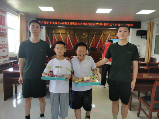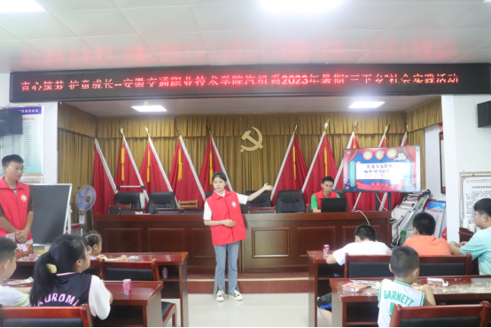 為加強愛國主義教育,守護兒童成長,實踐團在村委辦公室開展了“青心筑夢 護童成長”活動。愛國主義教育小課堂中,實踐團為小朋友們帶來了一節主題為“堅定文化自信 做新時代好少年”的思政小課堂,通過知識問答、動畫視頻等方式帶領小朋友們了解中華民族傳統美德,鼓勵小朋友們在生活中弘揚中華民族傳統美德,實踐團的兩名士官生和小朋友們分享了自己未來的職業,進行了軍體拳展示,在小朋友的心中埋下“保家衛國”的夢想種子。安全知識教育環節中,實踐團通過做游戲、知識問答的方式為小朋友們講解了交通安全、消防安全、防溺水、防拐騙等知識,提高小朋友的自我保護意識。活動最后,實踐團還為每個小朋友們送上了文具套裝,希望小朋友們認真學習,樹立遠大理想,做新時代好少年。