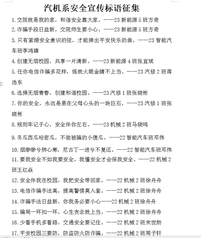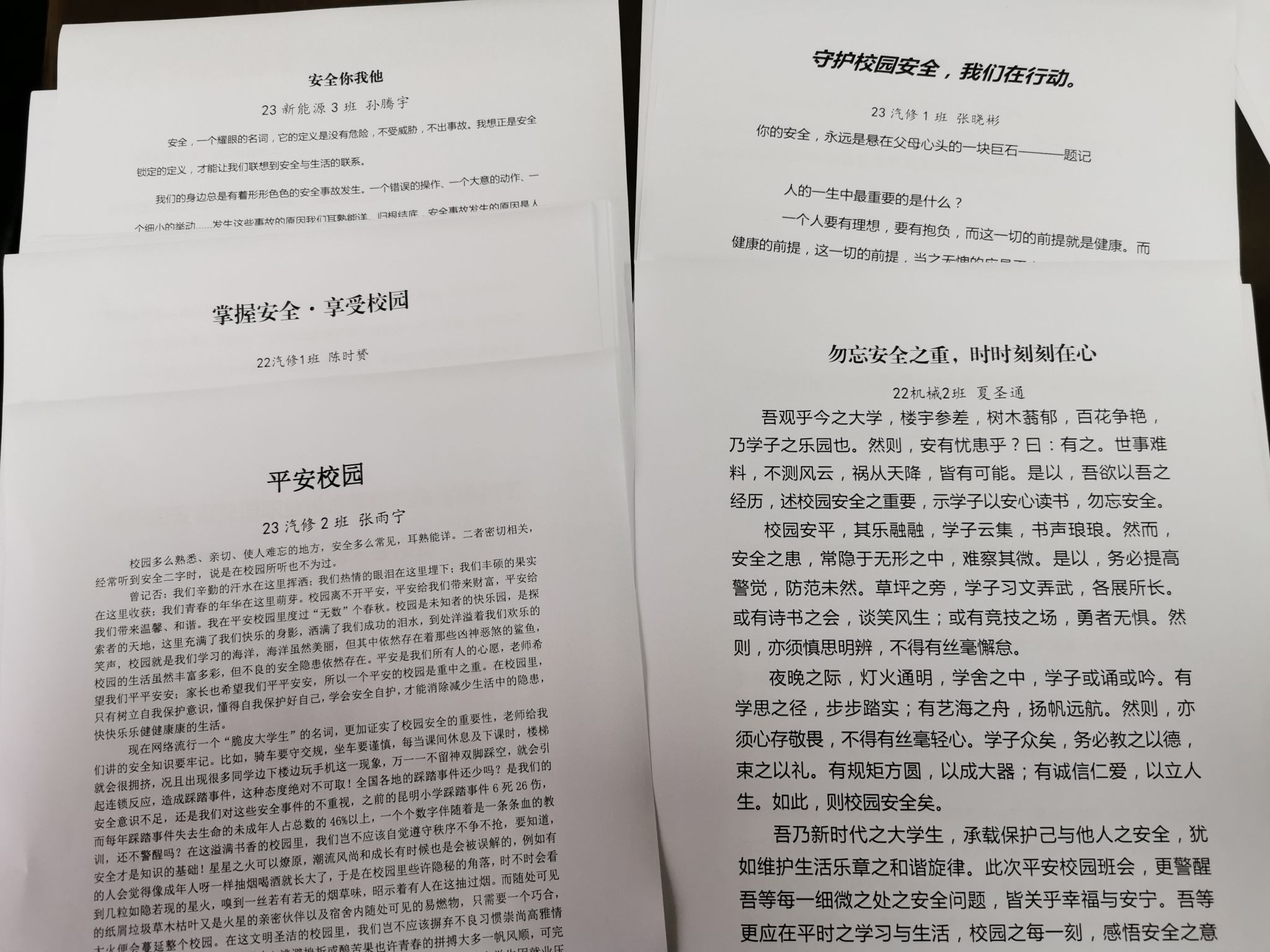 為促進(jìn)安全宣傳教育入腦入心,系部組織開展主題征文比賽,鼓勵同學(xué)們共述學(xué)習(xí)感悟、心得體會。同學(xué)們結(jié)合學(xué)校日常安全教育內(nèi)容及身邊的真實(shí)事件進(jìn)行創(chuàng)作,采用散文、議論文、文言文等多種形式,通過典型案例、經(jīng)驗(yàn)分享、社會現(xiàn)象等多個(gè)視角,記錄了自己對安全的理解和感悟,表達(dá)了對生命財(cái)產(chǎn)安全的關(guān)切之情。共收到征文作品20余篇,增進(jìn)了安全宣傳教育的效果。
