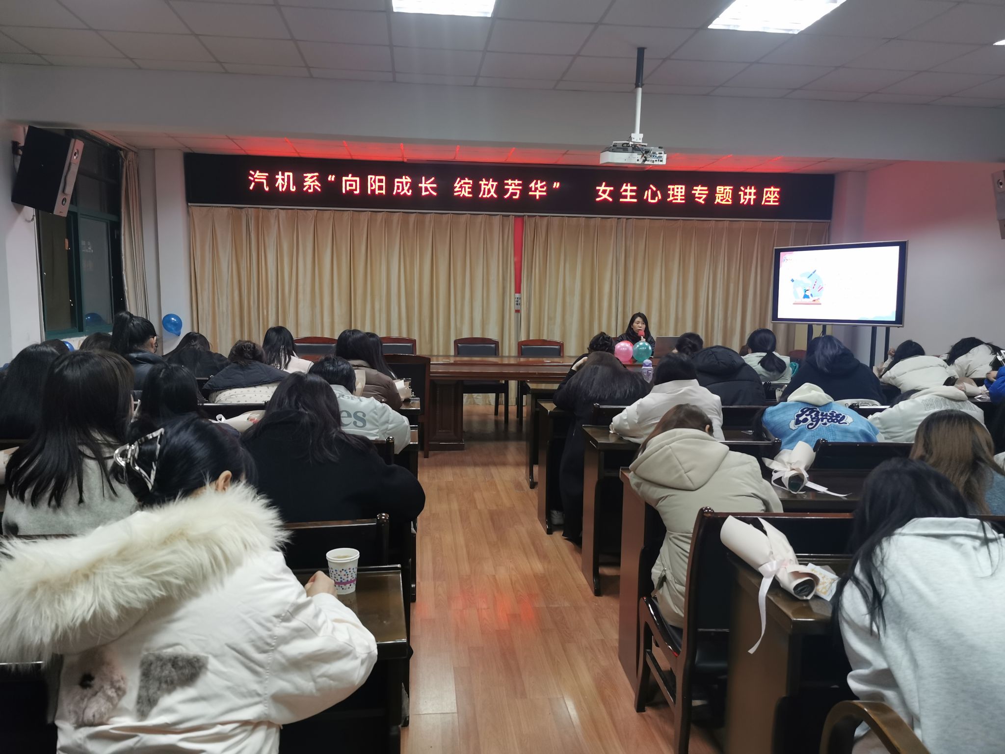為促進女性身心健康發展,進一步增強女生的自我防范和保護意識,3月7日晚,汽車與機械工程系在南區教學樓三樓會議室舉辦“向陽成長 綻放芳華”女生心理專題講座。活動邀請了合肥市第一人民醫院心理門診咨詢負責人劉金鳳作為主講人。劉金鳳以“與心靈相約 與健康同行”為題,從科學的角度講解了女生生理成長和心理發展的特殊性,同時結合實例和同學們探討了人際交往、個人發展的經驗方法,引導女生關愛自己,悅納自己,成為更好的自己。