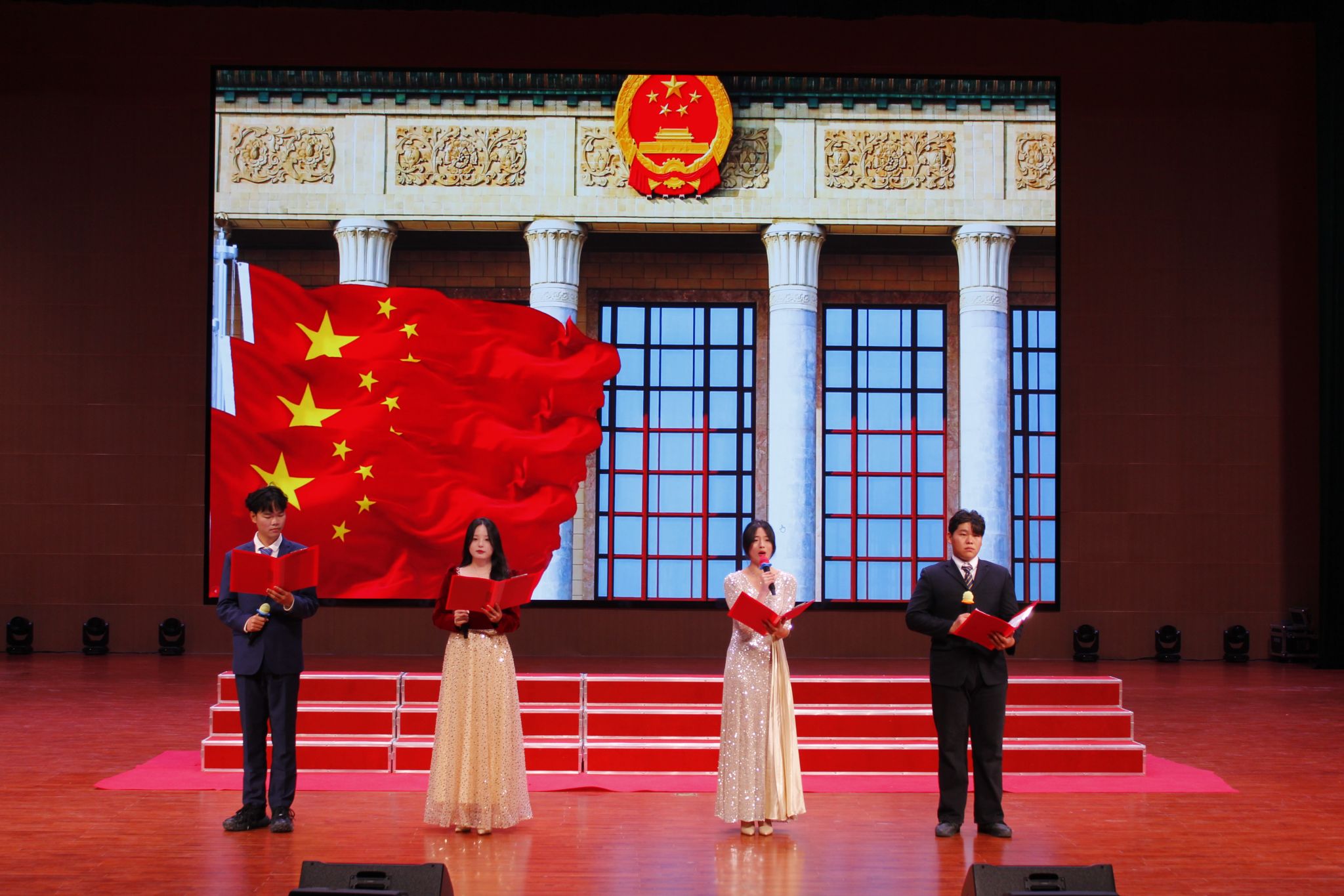 活動在新生代表深情演繹的詩歌朗誦《祖國,你就是我要唱的那首歌》中拉開帷幕,當朗誦者們用飽含深情的聲音訴說著對祖國的熱愛時,現場氣氛瞬間被點燃。一場音樂與情感交織的盛宴就此展開,現場紅旗飄揚,宛如一片紅色的海洋。