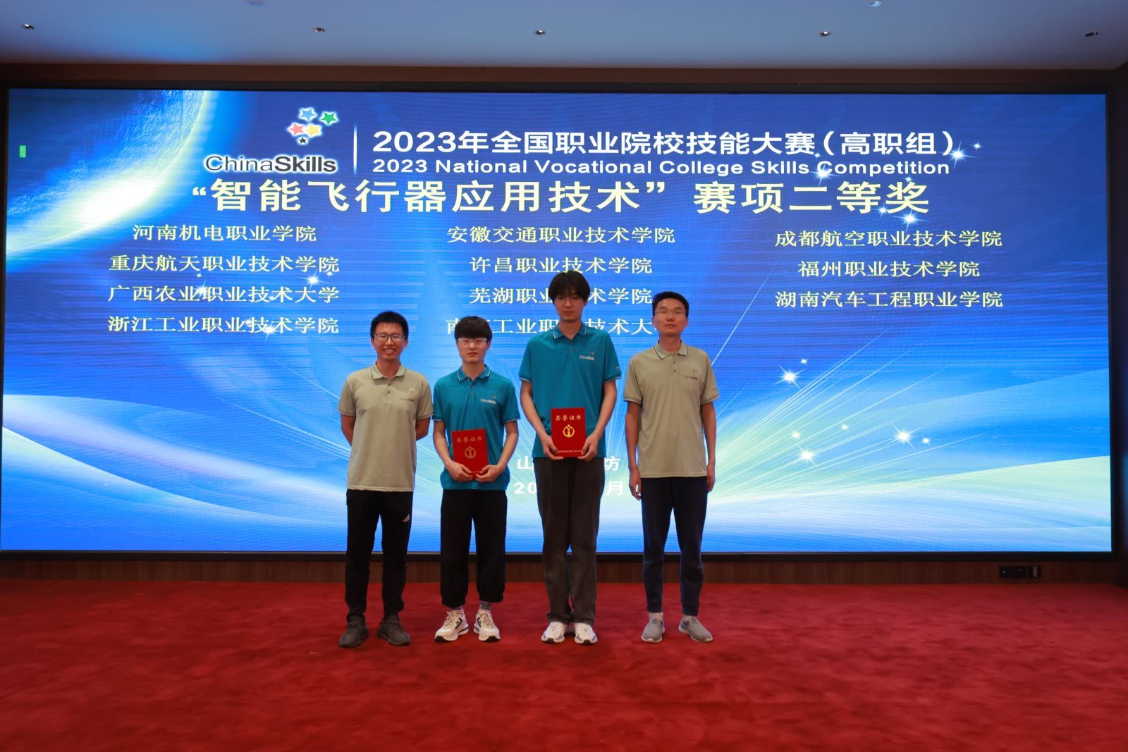 5月14日至15日,2023年全國職業(yè)院校技能大賽(高職組)“智能飛行器應(yīng)用技術(shù)”賽項(xiàng)在濰坊舉行。來自全國各省、自治區(qū)、直轄市等32個(gè)賽區(qū)的57支代表隊(duì),共計(jì)114名選手同臺(tái)競技。經(jīng)過兩天的激烈角逐,我院汽車與機(jī)械工程系張翼、王傳磊兩位教師指導(dǎo)的,來自21級無人機(jī)班的鄭騰想和22級無人機(jī)班的高承蘊(yùn)同學(xué)獲得二等獎(jiǎng)的優(yōu)秀成績。