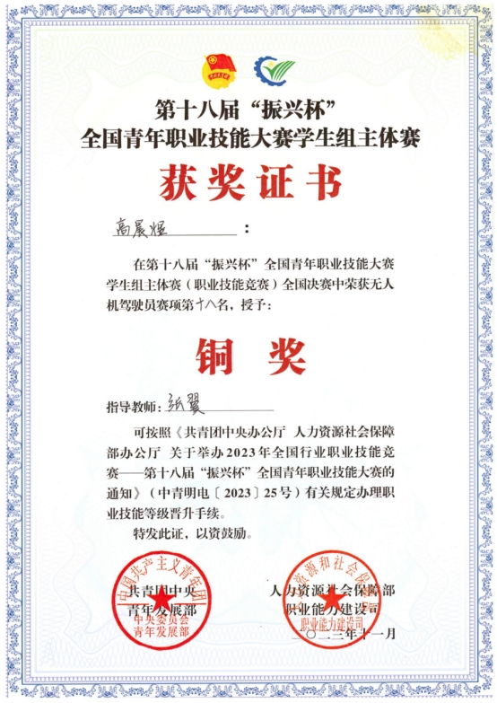 11月25日至28日,由共青團中央和人力資源社會保障部聯(lián)合舉辦的2023年全國行業(yè)職業(yè)技能競賽——第十八屆“振興杯”全國青年職業(yè)技能大賽在杭州成功舉辦。大賽聚焦新職業(yè)、新領(lǐng)域,首次設置無人機駕駛員等新工種賽項,進一步提升青年學生的技能水平,適應市場發(fā)展需求。我院汽車與機械工程系22無人機班的高晨煜同學在無人機駕駛員賽項中表現(xiàn)優(yōu)異,榮獲銅獎,將被授予“全國青年崗位能手”稱號。