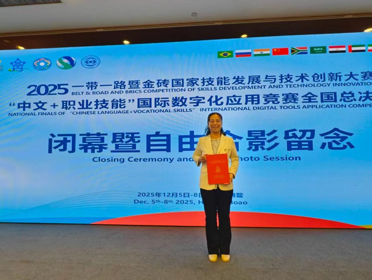 12月6日至8日,2025“一帶一路”暨金磚國(guó)家技能發(fā)展與技術(shù)創(chuàng)新大賽——“中文+職業(yè)技能”國(guó)際數(shù)字化應(yīng)用競(jìng)賽全國(guó)總決賽在海南博鰲成功舉辦。我校土木建筑學(xué)院教師李芙蓉憑借出色表現(xiàn),在賽事中斬獲全國(guó)總決賽教師組三等獎(jiǎng),為學(xué)校贏得榮譽(yù),彰顯了我校在“中文+職業(yè)技能”領(lǐng)域的教學(xué)實(shí)力。