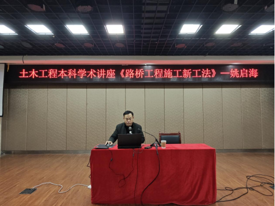 12月13日下午安徽建工建設投資集團有限公司技術中心主任姚啟海校友在學院大學生活動中心為土木工程系本科學生開展題為《路橋工程施工新工法》的學術講座,他以豐富的行業經驗、專業的技術知識和獨到的行業見解,深入淺出地為學生講解了土木工程行業的現狀、新材料、新技術、新工藝以及智能建造行業前景。