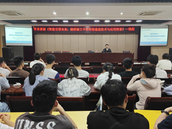 緊接著,他以三維模型的激光點云測量施工技術和大型裝配式箱梁工業化智能預制技術為例,聚焦路橋施工這一具體應用場景,詳細解析了這些技術如何通過精確測量、高效預制與裝配,提高施工效率與工程質量,減少了資源消耗與環境污染,讓在場學生深刻體會到智能技術在實際工程項目中的巨大潛力。