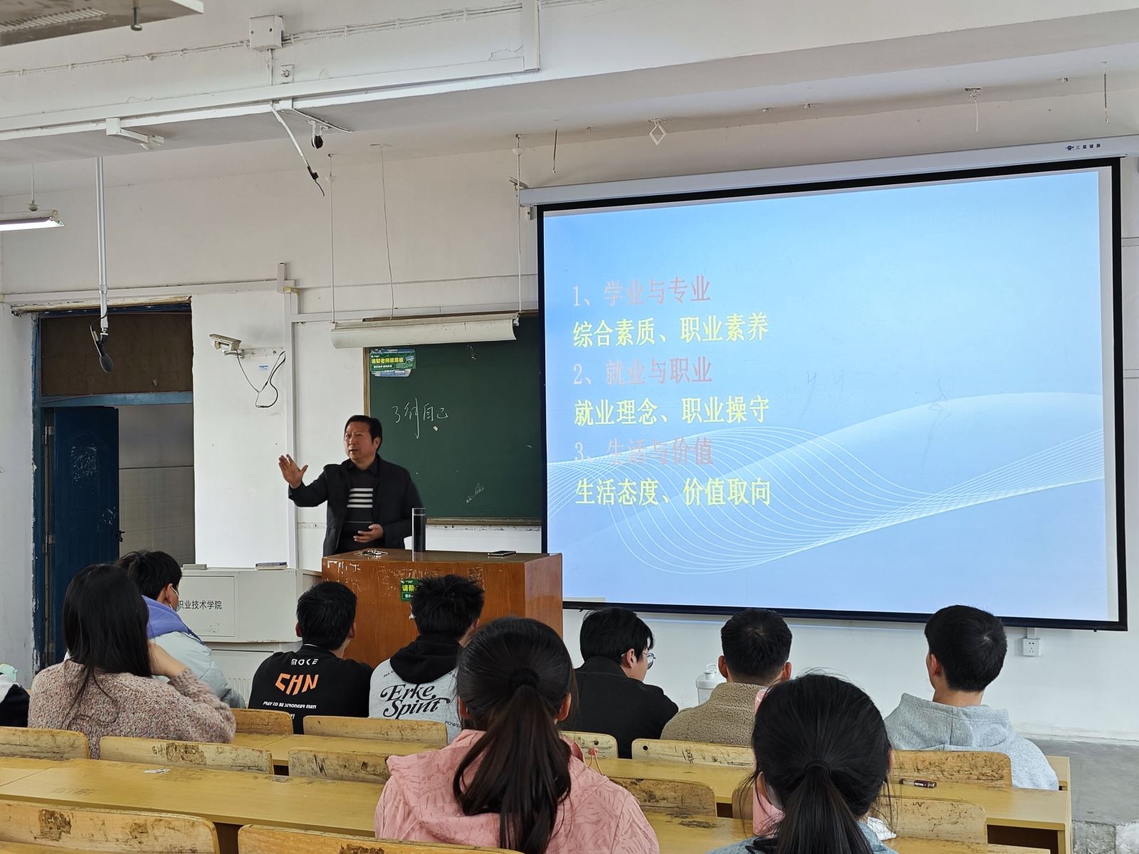 王守勝主任從學業與專業、就業與職業、生活與價值三個方面開展交流,加深學生對宏觀形勢的了解,盡早明確目標,隨后從疫情發展、行業發展、社會需求等方面分析了2024屆畢業生的就業環境,鼓勵同學扎實修煉內功,為考研或就業做好準備。