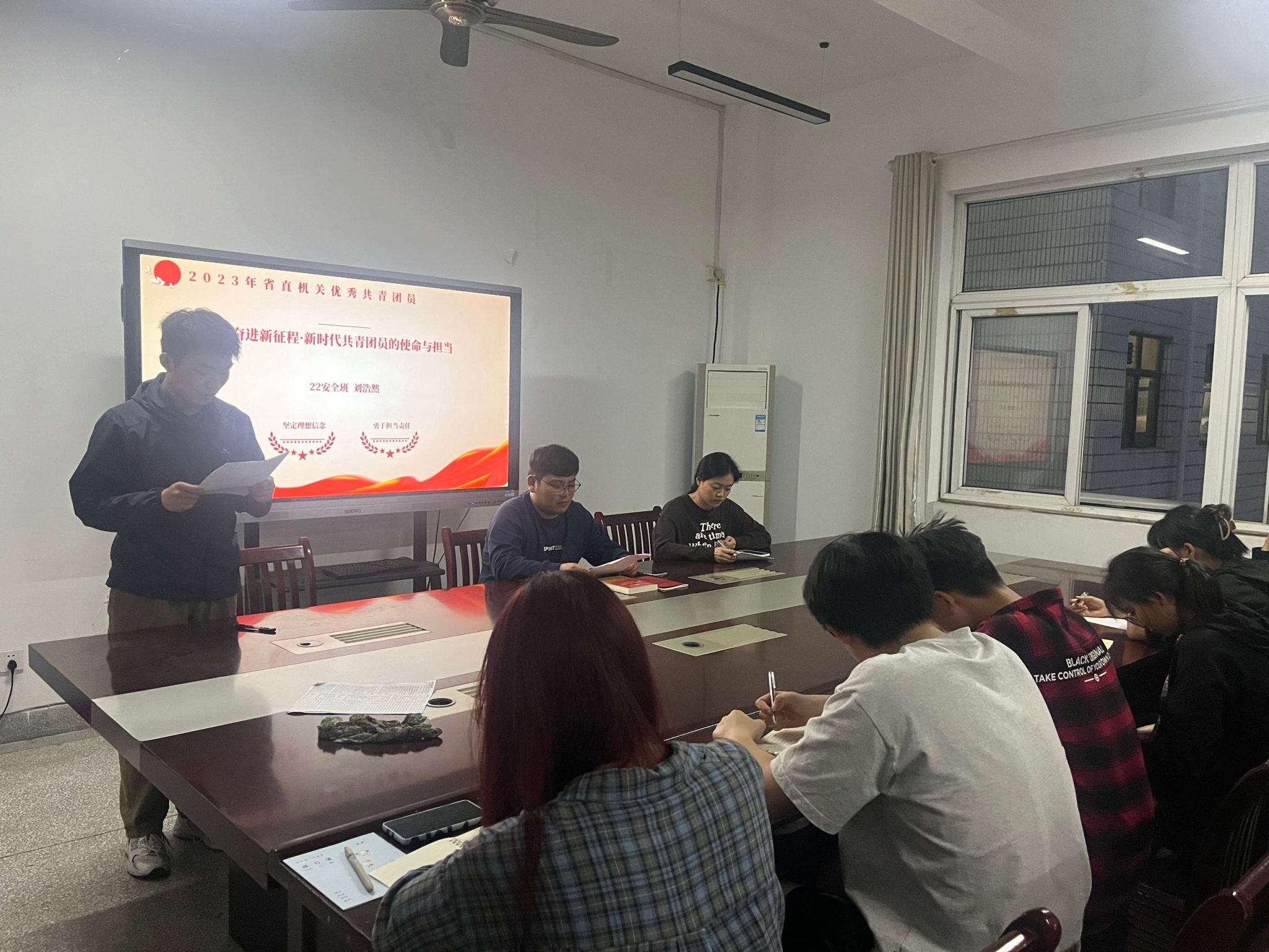 本次活動特地邀請了獲得“2023年度省直機關優秀共青團員”稱號的我系22安全班劉浩然同學進行報告分享。劉浩然同學連續4年獲得團員優秀評議等級,曾獲縣級優秀團員,代表學院參賽獲得消防安全類國賽二等獎,多次參加志愿服務,品學兼優。