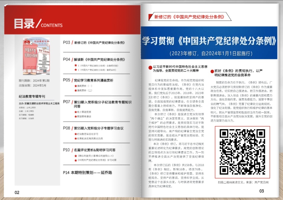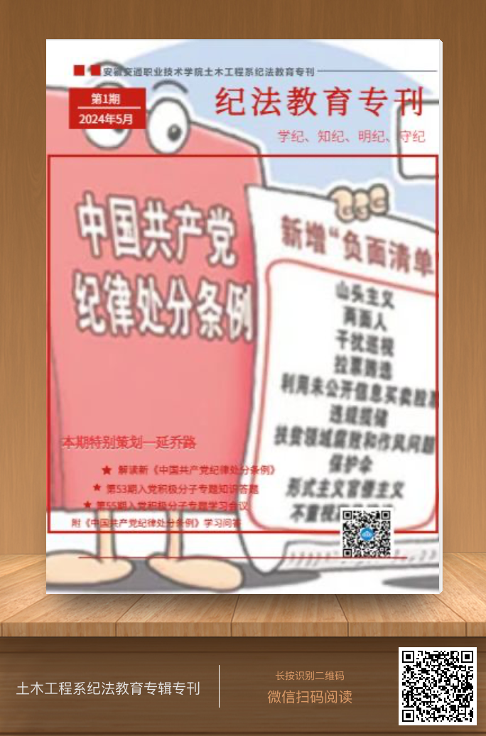 為積極響應(yīng)黨中央部署安排,深入開展黨紀(jì)學(xué)習(xí)教育,貫徹落實(shí)省交通運(yùn)輸廳全面動(dòng)員部署黨紀(jì)學(xué)習(xí)教育精神、學(xué)院黨委關(guān)于開展黨紀(jì)學(xué)習(xí)教育的實(shí)施方案,土木工程系以學(xué)習(xí)貫徹新修訂的紀(jì)律處分條例為契機(jī)加強(qiáng)紀(jì)律教育,編發(fā)完成了2024年首期《紀(jì)法教育專刊》。