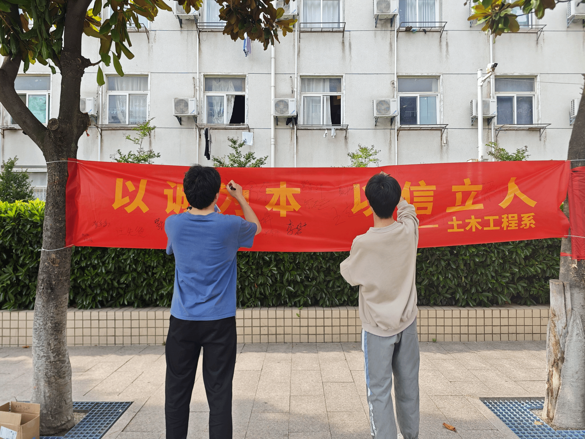 為弘揚交院“以誠為本 以信立人”的校園精神,土木工程系團總支學生會在我校學生宿舍樓下開展了“誠信簽名”的主題活動,通過活動加強我校學生誠信為本的理念。本次簽名活動交院學子積極參與,橫幅上的簽名正是學生們對誠信理念的肯定,活動氣氛熱烈,在學生會的宣傳下,同學們進一步加深了誠信意識,充分認識到誠實守信,理性消費的必要性和重要性。