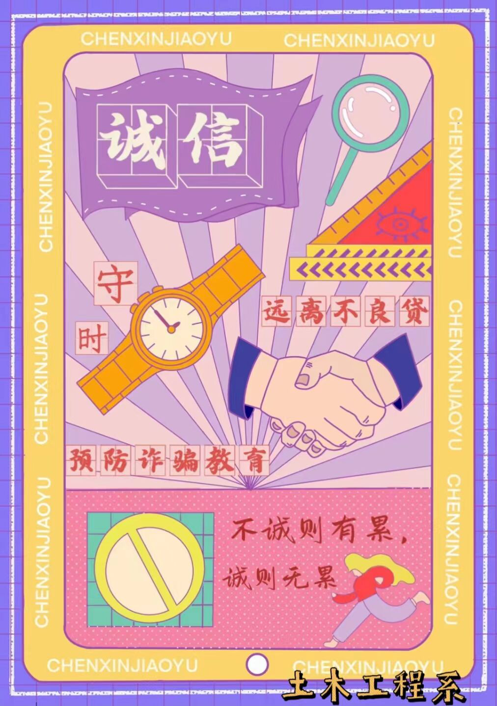 強化宣傳,進一步在土木系形成“誠信資助,立德樹人”的良好氛圍。為做好學生誠信教育工作,切實保障學生身體健康和生命安全,在公示欄張貼海報,學院從班級層次,在潛移默化中將誠信教育轉化為對學生的自我修養,讓學生自發、自覺、自悟的去體會誠信的內涵。
