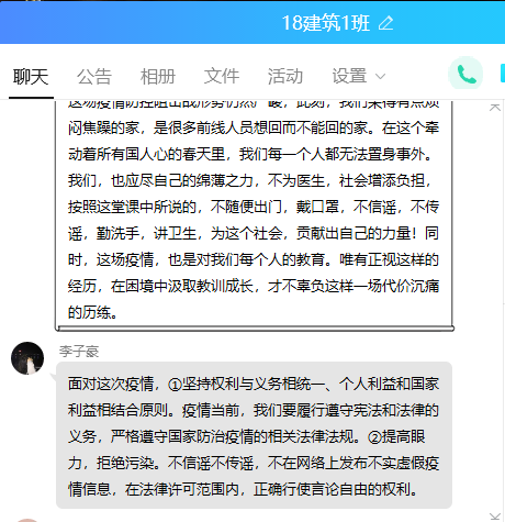 學(xué)生們通過(guò)微信、咪咕視頻、學(xué)習(xí)大國(guó)公眾號(hào)、群鏈接等方式在家或?qū)嵙?xí)單位自行學(xué)習(xí)了思政大課,并通過(guò)班級(jí)QQ群、微信群進(jìn)行交流。