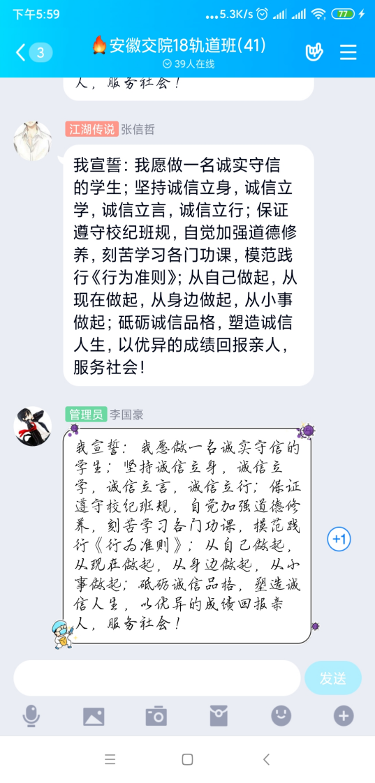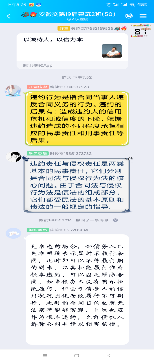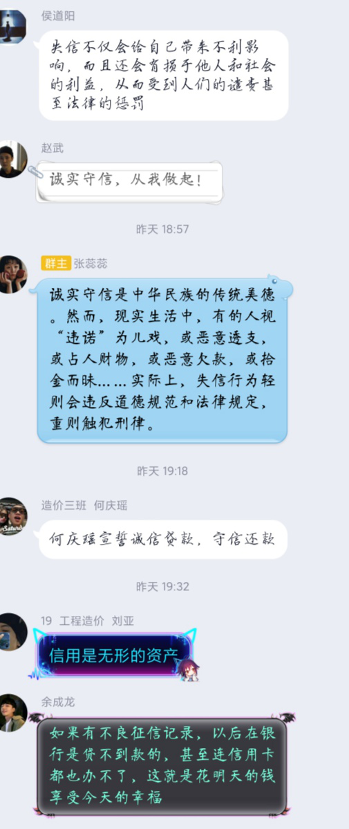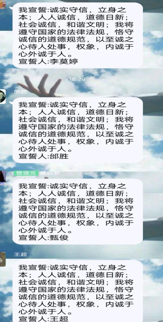 會議上19建筑二班班班長表示“同學們應該勵志學習,銘記不誠信帶來的后果。”19工程造價三班班長讓同學們在班群里積極發言,宣誓自己將誠信面對各種工作。通過這次班會,同學們領悟到了關于誠信教育的重要性以及不誠信給自己帶來的后果,班會取得了較好的效果,在一段段簡短的文字中,感受到了同學們進行誠信宣誓的真誠與莊嚴,線上主題班會圓滿結束。