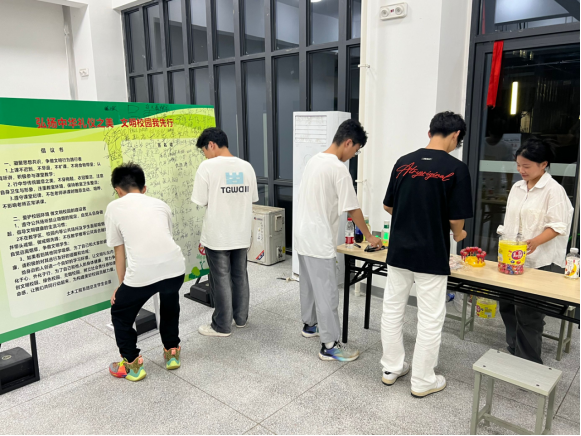 為了增強活動的參與度和影響力,團總支還精心策劃了一場現場倡議書簽字活動。活動當天,師生們紛紛在寫有以上倡議內容的展板上鄭重簽字,承諾將自覺遵守校園文明規范,共同維護良好的校園環境。這一舉動不僅彰顯了土木系師生的責任感和使命感,也為全校師生樹立了榜樣。給身邊的人創造一個良好的學習環境,讓文明禮儀內化于心,外化于行,為了自己和他人的身體健康,努力爭創文明校園、綠色校園、無煙校園,樹立社會責任感和使命感,讓我們共同行動起來,為構建美好校園貢獻力量。
