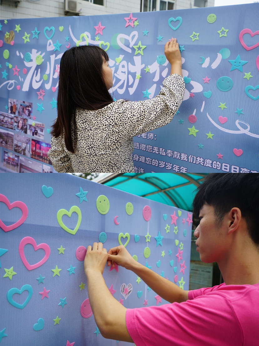 這面墻上有一封倡議信,寫到“親愛的老師,感謝您無私奉獻我們共度的日日夜夜,和您在一起的碎碎念念最終匯聚成終身難忘的歲歲年年。也許,我們曾經調皮頑劣讓您為之心累不已,從今天開始,課堂上的我們會認真聽課,拒絕手機,盡力做您心中的“好學生”。以燈傳燈,心燈不滅。今日不忘點燈人,此后共燃華夏天。”
