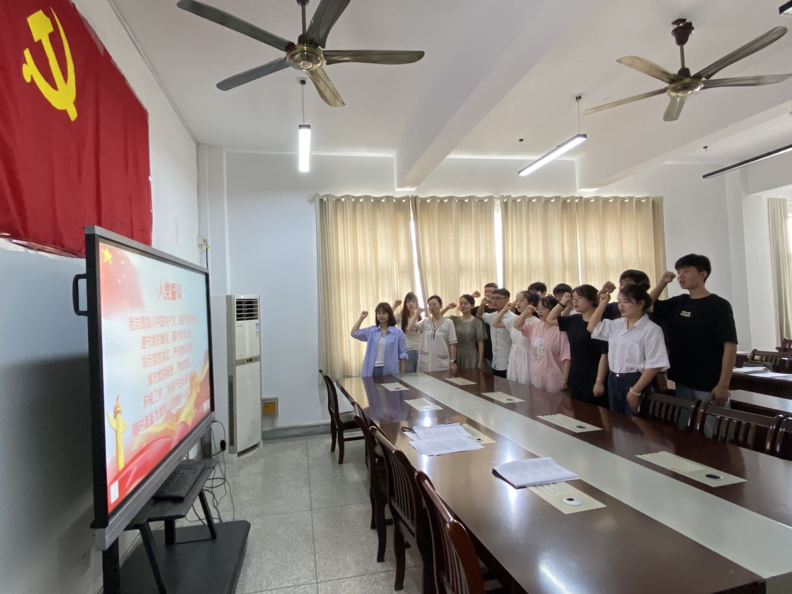 全體黨員面對黨旗進行莊嚴宣誓,在鮮艷的黨旗前,各位預備黨員握拳示意,慷慨激昂地宣讀了入黨誓詞。