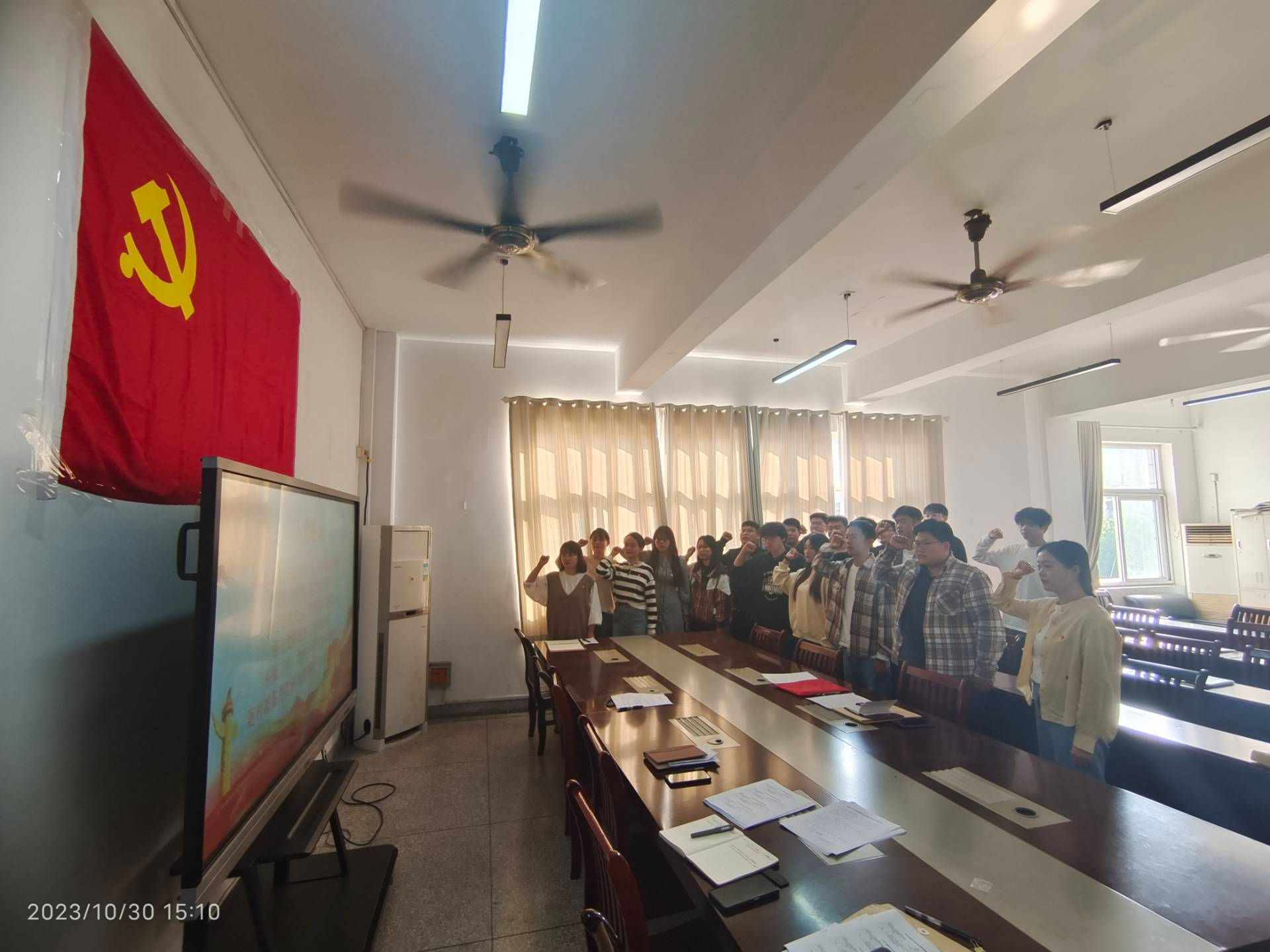 全體黨員面對(duì)黨旗進(jìn)行莊嚴(yán)宣誓,在鮮艷的黨旗前,各位預(yù)備黨員握拳示意,慷慨激昂地宣讀了入黨誓詞。